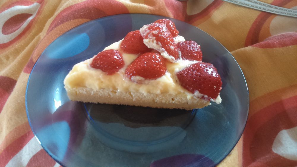 A tésztához kemény habbá verjük a tojások fehérjét a cukorral, majd a tojások sárgáját egyenként hozzáadjuk, és tovább verjük. Majd hozzákeverjük a lisztet, végül a megolvasztott, de nem meleg margarint. A margarinnal kikent sütőformában világosra sütjük. A tésztát kihűtjük. A pudingot felfőzzük és langyosra hűtjük, majd a kihűlt tésztára kenjük. A hűtőbe tesszük addig, míg a puding megdermed. Kirakjuk gyümölcsökkel. 1 csomag színtelen zselatint 3 dl vízben 2 evőkanál cukorral feloldunk, kissé hűtjük, amikor kezd kocsonyásodni, a gyümölcsök tetejére öntjük. A tejszínt felverjük és díszítjük.